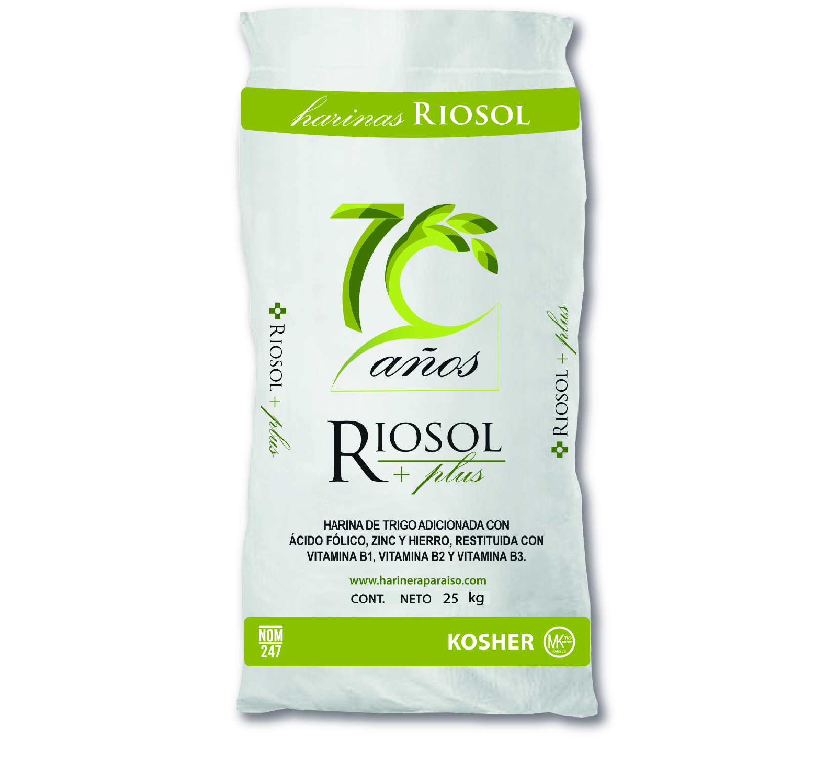 Harina Riosol Plus, harina de trigo fuerte, ideal para elaborar pan de miga más fina y uniforme, corteza firme y crocante, con mayor volumen en pieza, alto contenido de proteína.
