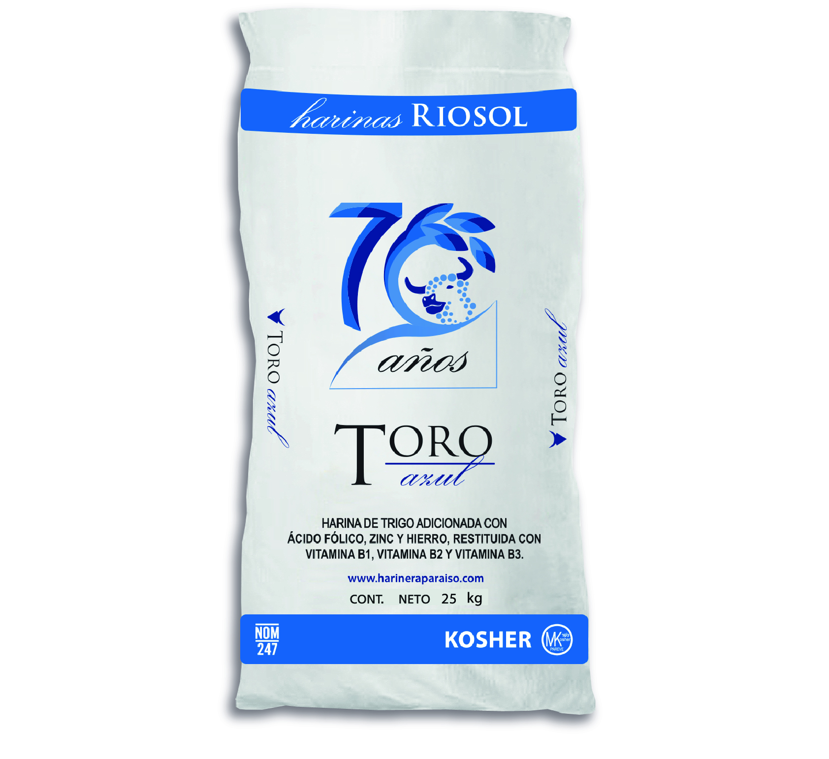 Harina Riosol Toro Azul, harina de trigo de media fuerza ideal para procesos manual artesanal o casero, en la elaboración de pan blanco y dulce, galletería, repostería, churros y buñuelos. Masas suaves muy dóciles de manejar, pan de miga uniforme, corteza crocante.